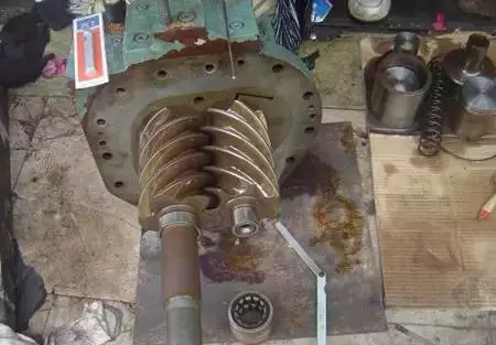 当螺杆空压机维修中转子的啮合端面转到与机壳排气相通时,(此时压缩气体之压力最高)被压缩之气体开始排出,直至齿峰与齿沟的啮合面移至排气端面,此时两转子啮合面与机壳排气口这齿沟空间为零,即完成(排气过程),在此同时转子啮合面与机壳进气口之间的齿沟长度又达到最长,其吸气过程又在进行。